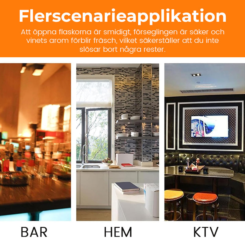 Detta är inte bara en flasköppnare; det är ett kompakt verktyg som kombinerar öppning, försegling och konservering av flaskor. Att öppna flaskorna är smidigt, förseglingen är säker och vinets arom förblir fräsch, vilket säkerställer att du inte slösar bort några rester.