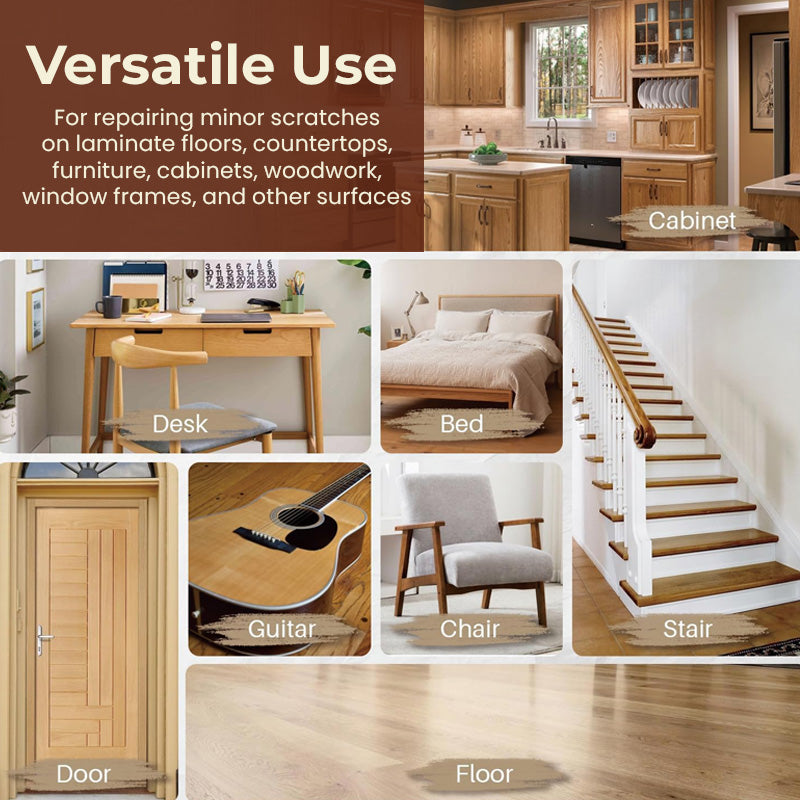 Rekommenderas för reparation av mindre repor på laminatgolv, bänkskivor, möbler, skåp, trävirke, fönsterkarmar etc.