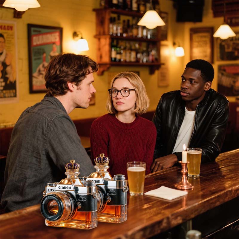 Varför nöja sig med ett enkelt glas när du kan rama in din drink som ett mästerverk? Denna kameraglasflaska inbjuder dig att pausa, beundra och kanske ta en bild innan du tar din första klunk.