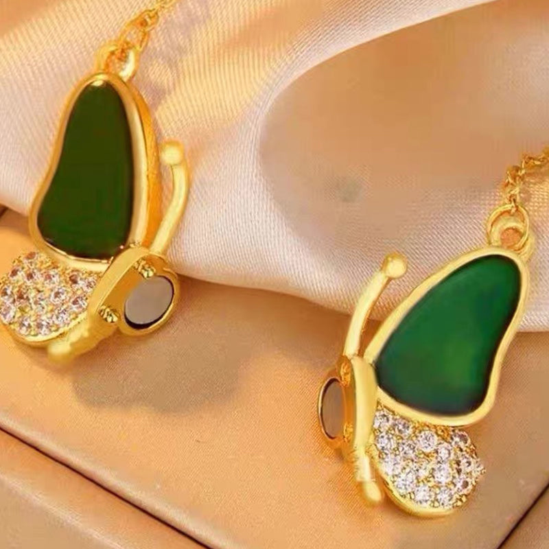 Upplev magin i förvandling med vårt färgskiftande fjärilshalsband. Se hur fjärilshänget skiftar färg beroende på din kroppstemperatur och avslöjar ett kalejdoskop av nyanser som återspeglar din unika energi och stil.